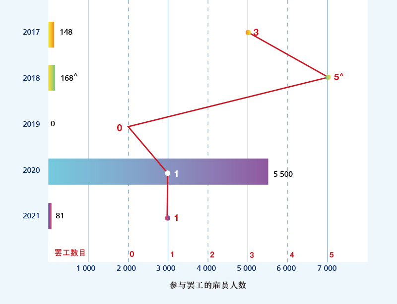 二零一七年至二零二一年罢工数目及参与罢工的雇员人数