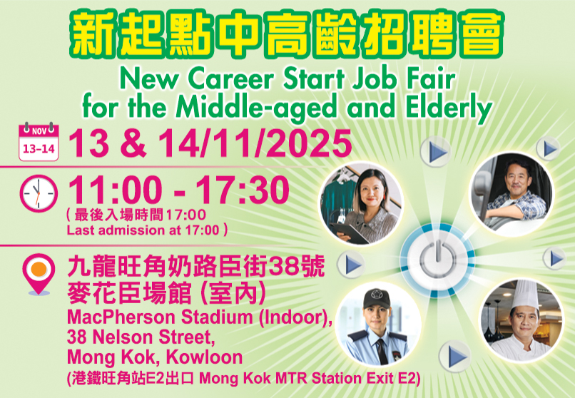 The Labour Department will organise the “New Career Start Job Fair for the Middle-aged and Elderly” at MacPherson Stadium (Indoor) in Mong Kok on 13 & 14 November 2025, from 11:00 am to 5:30 pm (final admission at 5:00 pm). Over 60 organisations will conduct on-the-spot recruitment, offering over 2 800 vacancies from catering, retail, and various industries. Enquiry: 2153 3982.