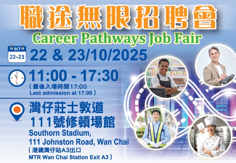 勞工處將於10月22日及23日上午11時至下午5時30分在灣仔修頓場館舉辦「職途無限招聘會」(最後入場時間為下午5時)。超過60間機構進行即場招聘,提供超過3 000個來自飲食、零售及各行各業的空缺。查詢: 2153 3985。