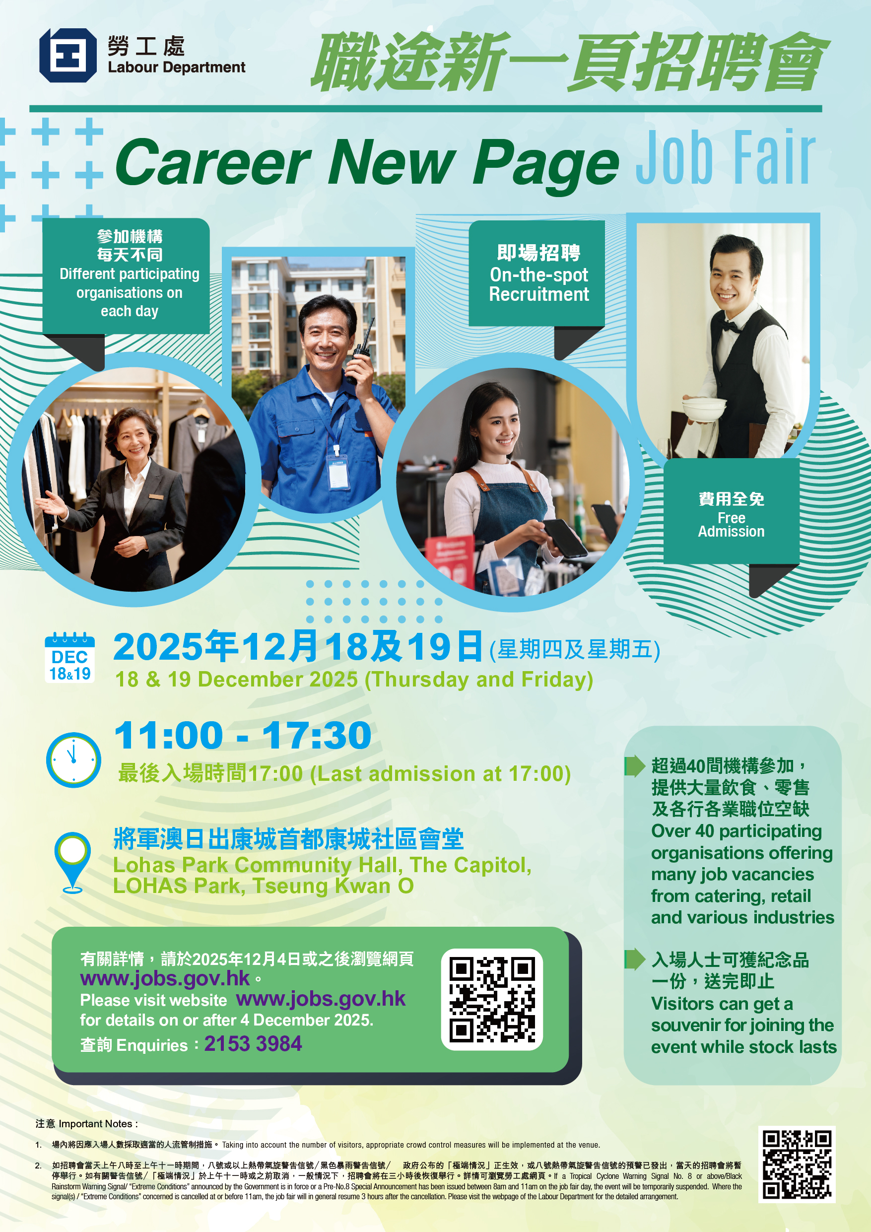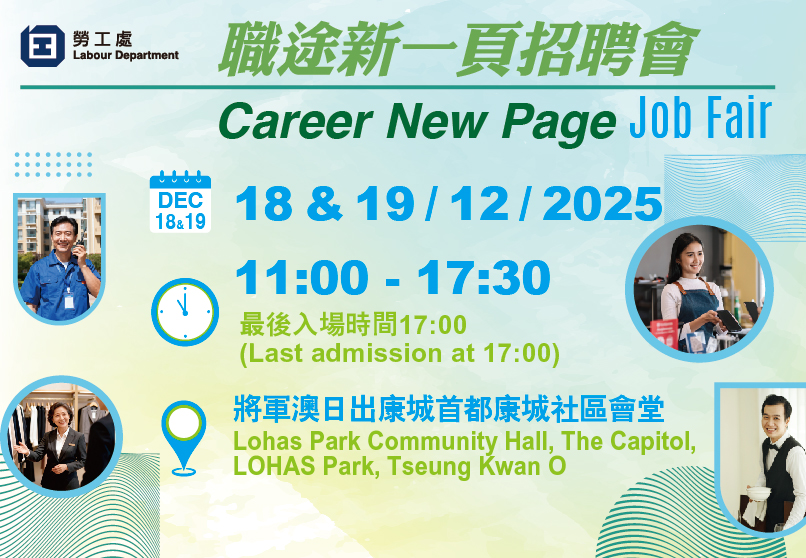 勞工處將於12月18及19日上午11時至下午5時30分在將軍澳康城社區會堂舉辦「職途新一頁招聘會」(最後入場時間為下午5時)。超過40間機構進行即場招聘,提供近1 900個來自飲食、零售及各行各業的空缺。查詢: 2153 3984。