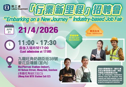 勞工處將於4月21日上午11時至下午5時30分在旺角麥花臣場館(室內) 舉辦「行業新里程」招聘會 (最後入場時間為下午5時)。超過30間機構進行即場招聘,提供大量來自飲食、零售職位空缺,同時有建造及物管業職位空缺。查詢: 3428 6066。